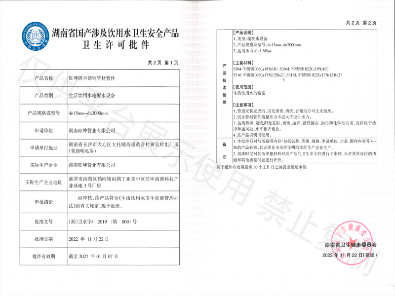 涉及饮用水卫生安全许可批件
