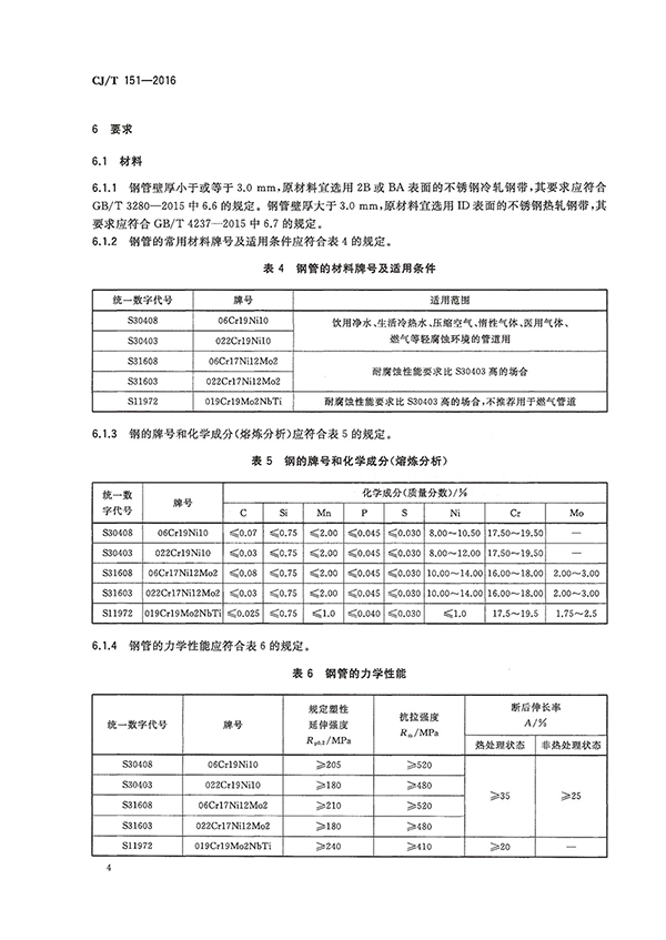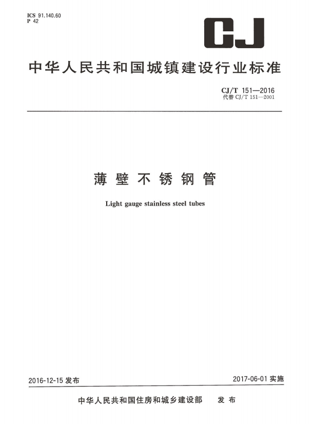 本标准规定了薄壁不锈钢管 (以下简称钢管) 的标记与标志、尺寸与偏差、重量、要求、试验方法、检验规则、包装、运输和贮存及订货。本标准适用于公称压力不大于 1.6 MPa,公称尺寸不大于 DN300,用于输送生活用水 (冷水、热水)、饮用净水、医用气体、压缩空气、惰性气体、燃气、燃油等薄壁不锈钢管设计、制造和验收。