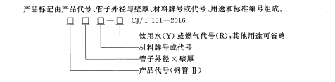 产品标记由产品代号、管子外径与壁厚、材料牌号或代号、用途和标准编号组成。标记格式:钢管 ID 管子外径 × 壁厚 材料牌号或代号(用途) CJ/T 151-2016